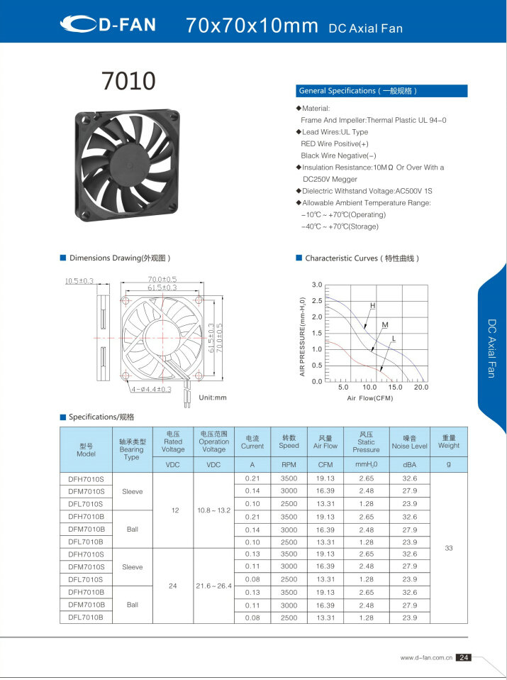 材料: 框架和葉輪:熱塑UL 94-0 引線.UL類型 紅色導(dǎo)線正極(+) 黑線負(fù)極(-) 絕緣電阻:10MΩ或以上,帶DC250V高阻表 介電耐壓:AC500V 1S 允許環(huán)境溫度范圍: -10℃-+70℃(運(yùn)行) -40℃-+70℃(儲存)